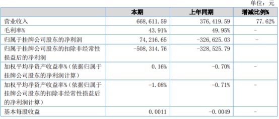 云鼎教育(430728)近日发布2021年半年度报告,报告期内公司实现营业收入668,611.59元,同比增长77.62%;归属于挂牌公司股东的净利润74,216.65元,较上年同期扭亏为盈。