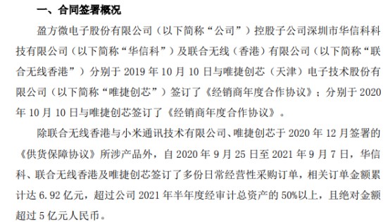 除联合无线香港与小米通讯技术有限公司、唯捷创芯于2020年12月签署的《供货保障协议》所涉产品外,自2020年9月25日至2021年9月7日,华信科、联合无线香港及唯捷创芯签订了多份日常经营性采购订单,相关订单金额累计达6.92亿元,超过公司2021年半年度经审计总资产的50%以上,且绝对金额超过5亿元人民币。